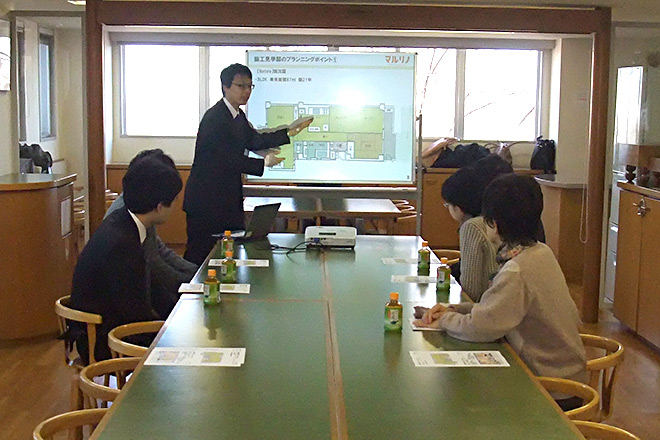 現場マンションの集会場で、施工責任者から見学前に概要説明。