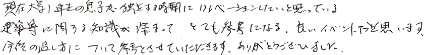 現在大学1年生の息子が独立する時期にリノベーションしたいと思っている。建築等に関する知識が深まってとても参考になる、