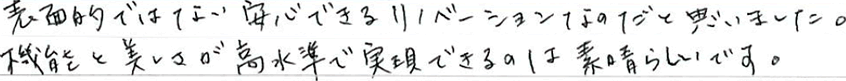 表面的でない安心できるリノベーションなのだと思いました。機能と美しさが高水準で実現できるのは素晴らしいです。- 品川区40代女性
